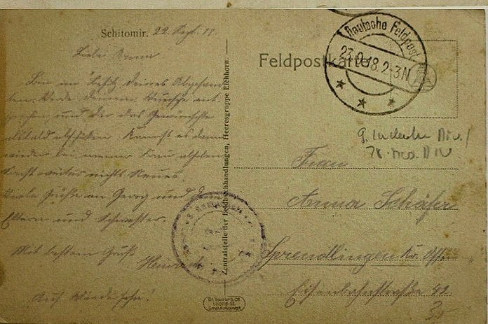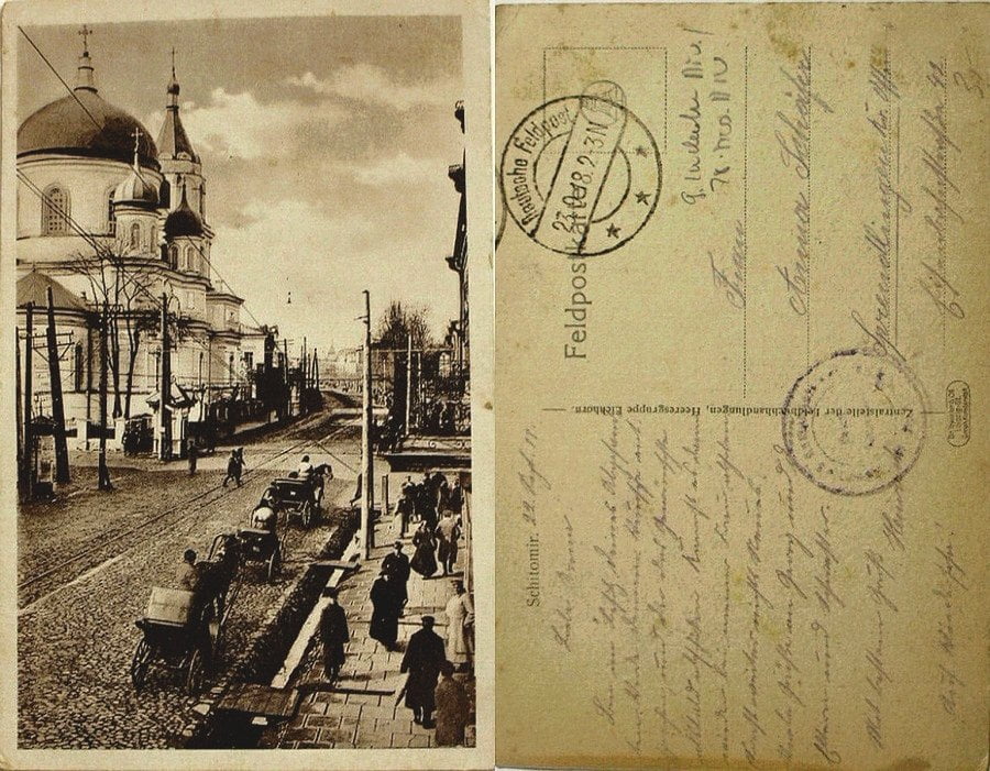 Фотолистівка (лист) 1918 року, Житомир, вулиця Київська, вид на Михайлівську церкву у напрямку соборної площі.