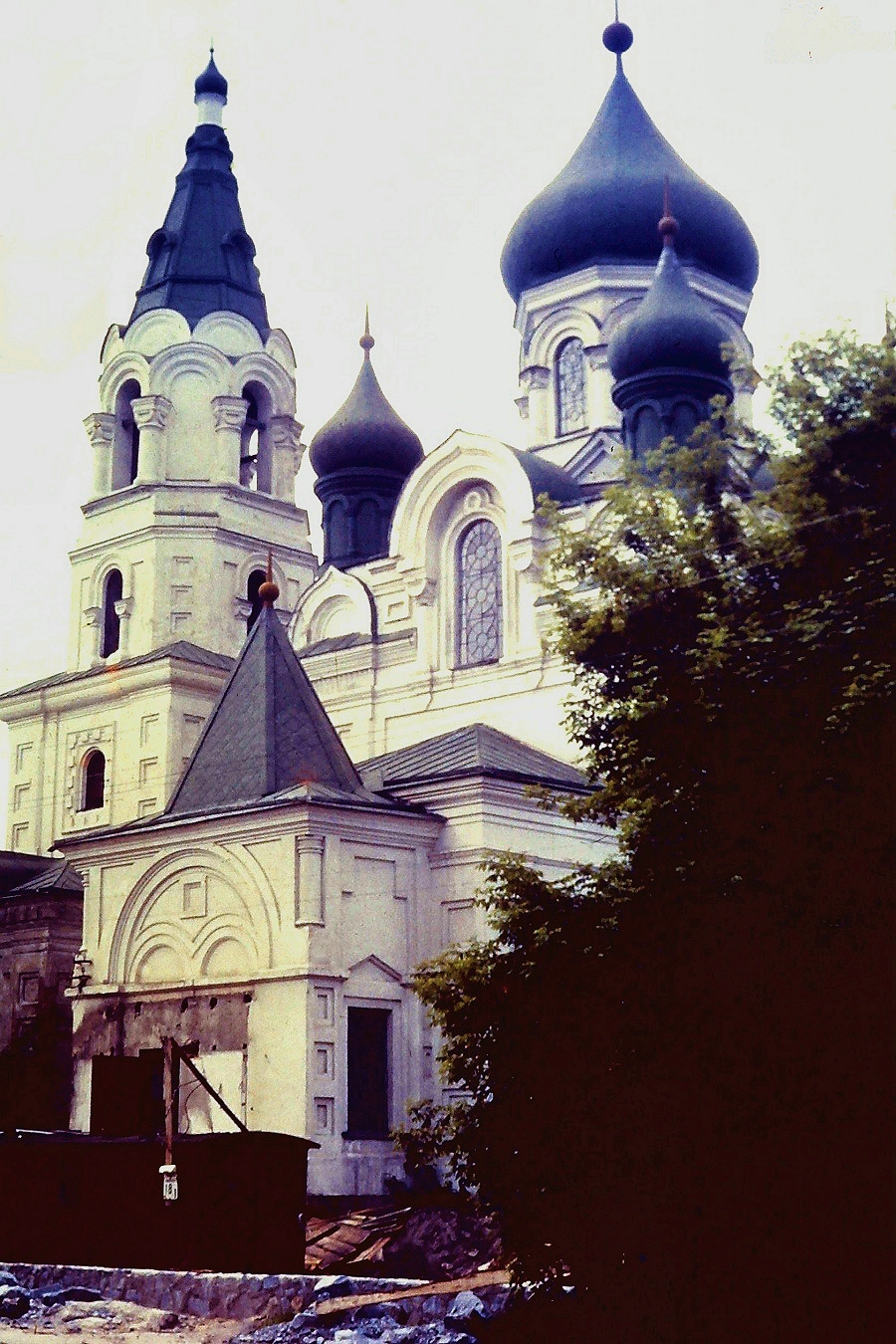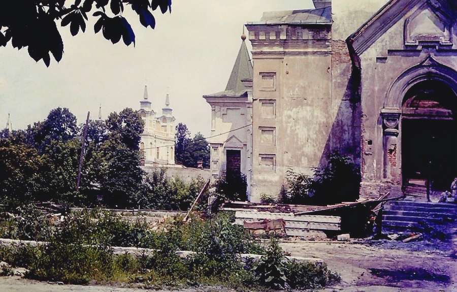 Фото Житомира, автора Бориса Дубмана, Хрестовоздвиженська церква на Замковій горі була збудована та освячена у грудні 1900 року. Але як храм при радянській владі вона діяла лише до початку 1930-х років. Потім на багато десятиліть вона використовувалася як склад баз “Воєнтога” та “Галантереї”. У 1972 році будинок церкви, що звільнився, за непотрібністю вирішили знести, підірвавши його. Врятував церкву від знесення колишній тоді начальник УКСу облвиконкому Володимир Федорович Нікулін. Він запропонував розмістити в будівлі музей природи, довівши, що знесення будівлі коштує дорожче за реконструкцію. У 1985 році реконструкцію розпочали і у 1987 році закінчили. На фотографії початок реконструкції Хрестовоздвиженської церкви під музей. 25 років у ній буде музей природи. Нині церква працює і в ній проходять служінння..