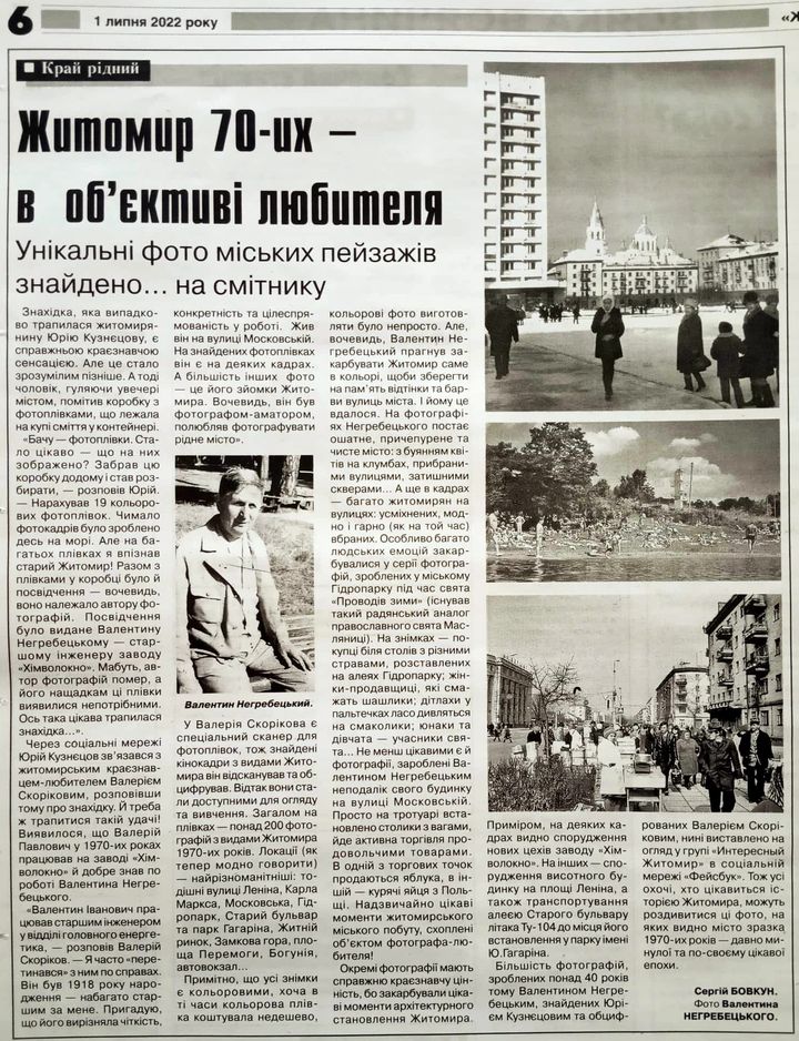 Знахідка, яка випадково трапилася житомирянину Юрію Кузнецову, є справжньою краєзнавчою сенсацією. Але це стало зрозумілим пізніше. А тоді чоловік, гуляючи увечері містом, помітив коробку з фотоплівками, що лежала на купі сміття у контейнері, – Бачу фотоплівки. Стало цікаво що на них зображено? Забрав цю коробку додому і став розбирати, розповів Юрій. Нарахував 19 кольорових фотоплівок. Чимало фотокадрів було зроблено десь на морі. Але на багатьох плівках я впізнав старий Житомир! Разом з плівками у коробці було й посвідчення, вочевидь, воно належало автору фотографій. Посвідчення було видане Валентину Негребецькому, старшому інженеру заводу «Хімволокно». Мабуть, автор фотографій помер, а Його нащадкам ці плівки виявилися непотрібними. Ось така цікава трапилася знахідка.
