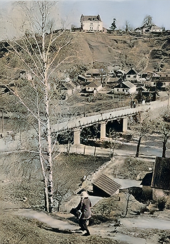 Фото Житомира старого дерев’яного Подільського мосту на вулиці Трояновській через річку Кам’янка, побудований на початку XIX століття. На той час це був єдиний міст у Житомирі. Простояв він до 1977 року. На правому березі (передній план) – Мальованка. На лівому березі внизу – вулиця Млинна на Подолі. Вгорі на Охрімовій горі – Покровська церква, збудована наприкінці ХІХ століття біля древнього православного цвинтаря. Цвинтар при радянській владі було знищено, а церква збереглася досі, але перебуває в аварійному стані.