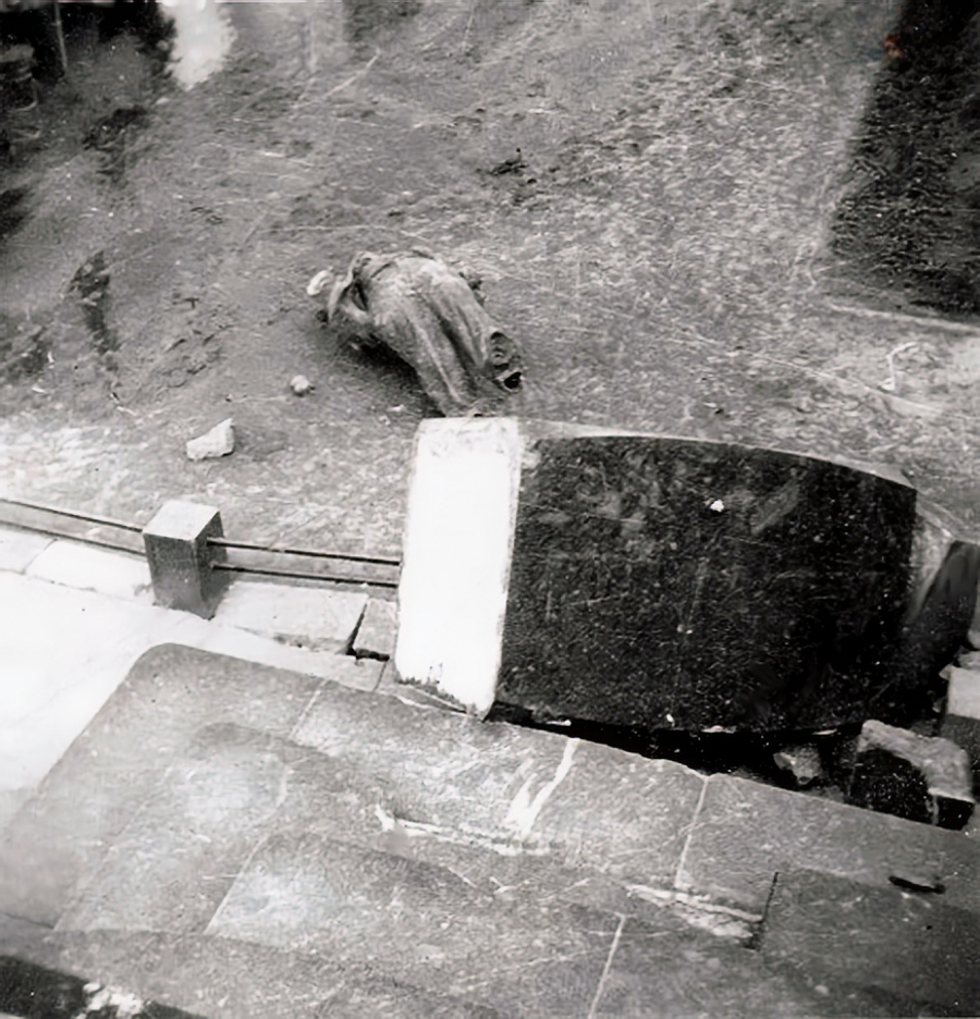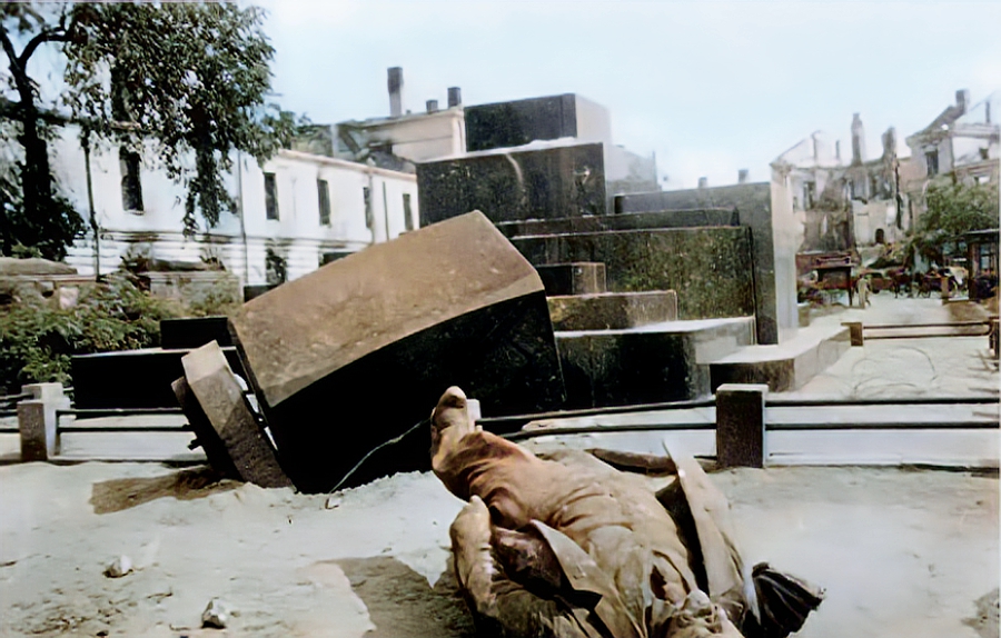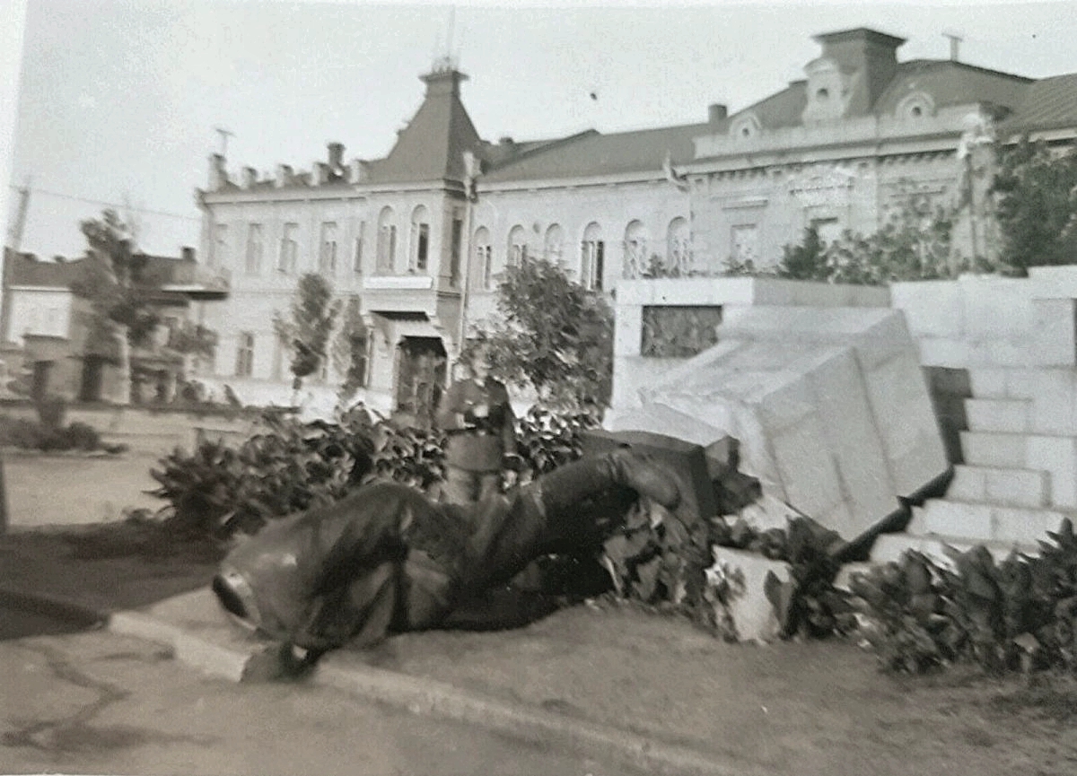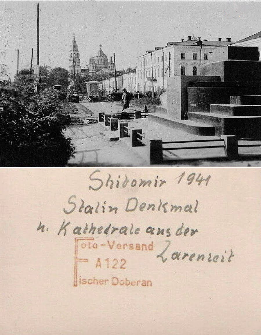 Фото Житомира, зроблене у 1941-му році, окупація, зруйнований німцями пам’ятник леніну (ул’янову) на Соборній (бувш. р. люксембург), який був встановлений у 1925-му році.
